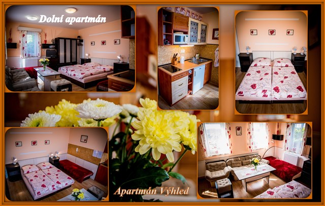 Apartmán Výhled je umístěn v samostatné budově na pozemku 3000 m2. Na protilehlém konci je dům majitelů.V budově se nachází Horní a Dolní apartmán ,přijímací kancelář,kolárna a kotelna.Budova je vsazena do svahu a díky tomu má každý apartmán vlastní vchod, venkovní terasu a parkoviště. Společná je pouze kolárna.
